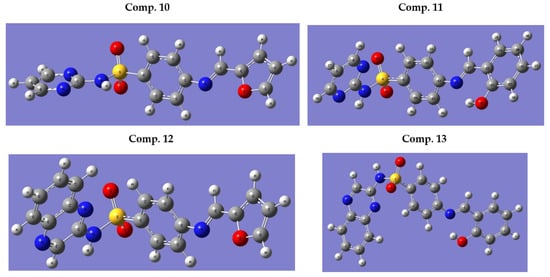 Structures of the tested compounds were optimized using density functional theory (DFT) in combination with Beck’s three-parameter exchange functional along with the Lee–Yang–Parr non-local correlation functional (B3LYP) [41,42,43] with the 6-31+G(d,p) basis set, which is implemented in the Gaussian 09 program package [44,45]. The quantum chemical calculation studies were performed to make a comparison between the stabilities of the newly synthesized compounds in Z- and E-forms. The quantum chemical calculations displayed that compounds 13, 10, 11, and 12 were more stable in the E-forms than the Z-forms, by about 0.021, 0.053, 0.023, and 0.003 a.u., respectively, which agree with the experimental findings. Figure 4 shows the optimized molecular structures of the investigated compounds with minimum energies obtained from the calculations.