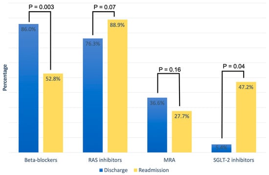 Table 2 summarizes the cardiovascular medical therapy upon discharge and readmission based on LV function categories. At discharge from the hospital, GLMT included the following medications: 86% beta-blockers, 76.3% RAS inhibitors, 36.6% MRAs, and 5.4% SGLT-2 inhibitors. Overall, there was no significant difference in cardiovascular medication at hospital discharge between the three LV function categories. A direct comparison of HF medication between discharge and readmission in patients readmitted for AHF showed a non-significant increase in treatment with RAS inhibitors (76.3% vs. 88.9%, p = 0.07) and a significant of SGLT-2 inhibitors (5.4% vs. 47.2%; p = 0.04), while the proportion of patients on beta-blockers (86% vs. 52.8%; p = 0.003) decreased significantly. MRA treatment also decreased on readmission compared to discharge, but without a significant difference (36.6% vs. 27.7%, p = 0.16) (Figure 1).