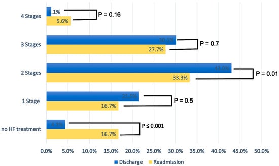 Figure 2 displays the percentage of patients according to the four stages of GDMT at discharge and readmission. At discharge, 43% of patients were on a two-stage GDMT and 30.1% on a three-stage GDMT. At readmission, the percentage of patients at all stages of GDMT (one to three) was considerably lower compared to hospital discharge; the difference was statistically significant for three-stage GDMT (p = 0.01). In addition, the percentage of patients who did not receive HF therapy at readmission increased significantly (4.3% vs. 16.7%, p < 0.001), with non-compliance with therapy being the main reason.