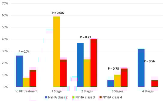 Additionally, Table 3 shows the relationship between HF medication and NYHA class, and Figure 3 shows its distribution according to the four stages of GDMT. We found no significant difference in HF therapy in relation to NYHA class (Table 3). While NYHA class 3 patients most frequently received one-stage HF therapy (59%), the proportion of NYHA class 4 patients receiving two-stage HF therapy increased to 40%, without any significant difference between discharge and readmission (Figure 3). The influence of comorbidities on treatment is shown in Table 4.