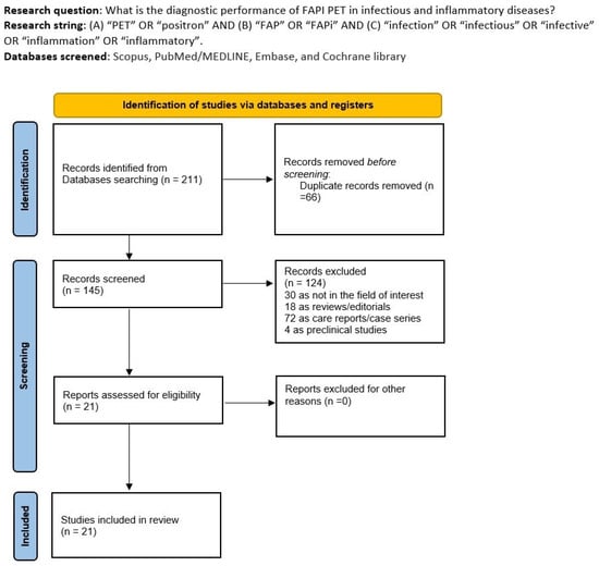 We conducted this systematic review following a preset protocol, and we used the “Preferred Reporting Items for a Systematic Review and Meta-Analysis” (PRISMA 2020 statement) as a guideline for development and reporting. The complete PRISMA checklist is available in Supplementary Table S1. We started formulating this review query: What is the diagnostic role of FAPI PET in infectious and inflammatory diseases? Following the Population, Intervention, Comparator, and Outcomes (PICO) framework, we defined the following criteria for research inclusion: studies performed on patients with suspected infectious or inflammatory disease (Population), having PET with FAPI (Intervention), and with or without a comparison with standard-of-care imaging (Comparator) [11]. Our main outcome was the diagnostic role of FAPI PET in infectious or inflammatory diseases.