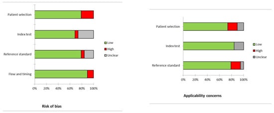 For the investigation of the risk of bias in each study and for the analysis of the relevance of each paper to the review query, we referred to QUADAS-2, an instrument created to assess the quality of studies based on the accuracy of diagnostic procedures. The quality of the included studies in the systematic review was analyzed by two researchers independently. They described four different domains (patient selection, index test, reference standard, and flow and timing) for the assessment of the bias risk, and three domains (patient selection, index test, and reference standard) for applicability.