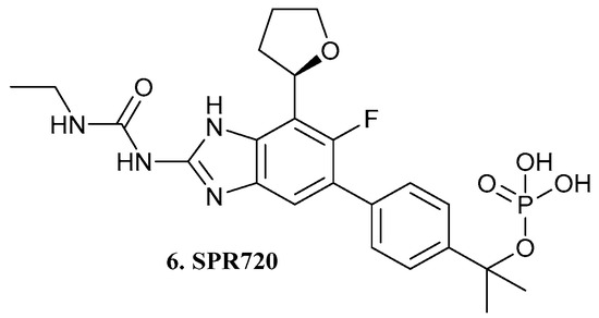 Currently, the DNA gyrase inhibitor SPR720 (6, Figure 3), a stable phosphate prodrug of SPR719, is under development for the treatment of pulmonary tuberculosis and nontuberculous mycobacterial pulmonary disease. In vivo, this new aminobenzimidazole prodrug converts into SPR719, targeting the ATPase subunits of bacterial DNA gyrase. A phase I clinical trial (NCT03796910) was conducted to evaluate the safety, tolerability, and pharmacokinetics of SPR720/SPR719, predicting that a once-daily administration of SPR720 could promote SPR719 therapeutic exposure [20].