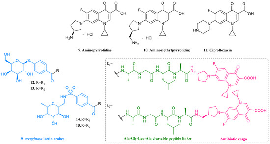 Structure of aminopyrrolidine (9), aminomethylpyrrolidine (10) ciprofloxacin (11), and biofilm-targeted prodrugs 12–15. P. aeruginosa lectin probes, cleavable peptide linkers and antibiotic cargos are highlighted in blue, green and pink, respectively [22].