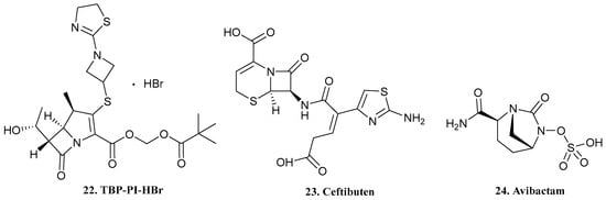 Structure of TBP-PI-HBR (22), ceftibuten (23), and avibactam (24) [24,25,26,27,28,29,30].