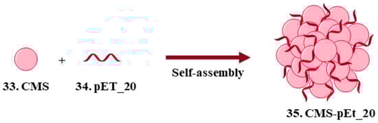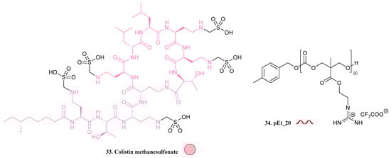 In the same year, a colistin methanesulfonate (CMS, 33, Figure 11) nanoassembly was reported; CMS being a colistin prodrug formulated for aerosol administration. Colistin (polymyxin E) is a last-resort drug for the treatment of MDR and XDR Gram-negative infections when other clinically available drugs show no efficacy. However, colistin resistance is emerging and the treatment outcome of resistant strains is compromised [33,34]. In view of overcoming colistin resistance, Zhao et al. [34] developed an anionic CMS and guanidium-functionalized cationic antimicrobial polymer pEt_20 (34, Figure 11) nanocomplex, named CMS-pEt_20 (35, Scheme 2), expecting the co-delivery of both agents. In vitro assays were performed in E. coli CMS-resistant strains with a MIC value of 7.8 µg/mL and, at this concentration, the nanoparticles exhibited biocompatibility. This complex also enabled the eradication of clinically isolated colistin-resistant bacteria, namely, MDR E. coli and K. pneumoniae, and the reversal of colistin resistance, while the single administration of the polymer or the antibiotic led to no results. Hence, this nanocomplex approach may become a potent strategy to treat colistin-resistant MDR bacterial strains.