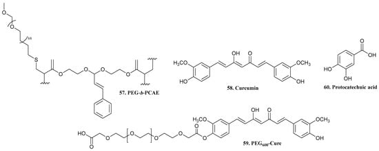 Structure of PEG-b-PCAE (57), curcumin (58), PEG600-Curc complex (59), and protocatechuic acid (60) [42,43,44].