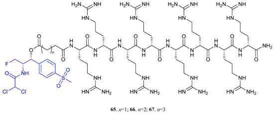 Structure of florfenicol-polyarginine conjugates 65–67. Florfenicol moiety is highlighted in blue [48].