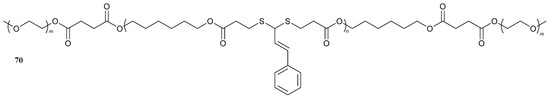 In the same year, Lu’s group [52] reported the preparation of a novel prodrug system consisting of a PEGylated ROS-responsive polymeric prodrug of the natural antibacterial agent CA (70, Figure 22). This compound exhibited bactericidal effects against E. coli (MIC = 400 µg/mL) and S. aureus (MIC = 100 µg/mL) strains and, also, the degradation of its nanoparticles led to the “self-destruction” of the Gram-positive pathogens. Moreover, free CA exhibits MIC values of 160 µg/mL against E. coli and 80 µg/mL against S. aureus strains. However, the complete degradation of 400 µg/mL of prodrug nanoparticles would yield the release of 70.08 µg/mL of CA, a concentration significantly lower than its MIC value, suggesting the enhanced potency of the prodrug compared to free CA. Additionally, the prodrug exhibited good biocompatibility and reduced cytotoxicity when compared to the free drug.