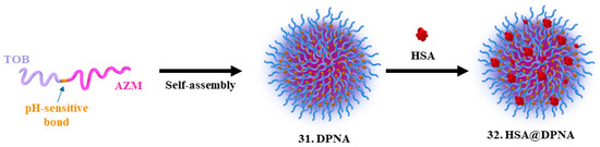 Nanotechnology has shown promising potential against AMR. Tobramycin (TOB, 29, Figure 10), an aminoglycoside antibiotic, and azithromycin (AZM, 30, Figure 10), belonging to the macrolide family of antibiotics, have demonstrated therapeutic effects in cystic fibrosis patients, which are particularly vulnerable to infections caused by P. aeruginosa biofilms. In this context, a human serum albumin (HSA)-coated dimeric prodrug-based nanoassembly (DPNA, 31, Scheme 1) to deliver TOB and AZM was developed by Li et al. [14,32], in 2023. This nanocomplex, named HSA@DPNA (32, Scheme 1), was obtained by insertion of pH-sensitive citraconic amide bonds between the two drugs, and exhibited stability under physiological conditions (Scheme 1). For DPNA and HSA@DPNA, pH-dependent antibacterial activity was observed. At pH 7.4, both exhibited MIC values greater than 128 µg/mL. However, at pH 5.5, the MIC values decreased to 1.0 µg/mL, reaching the value determined for the TOB/AZM mixture and suggesting the activation of the prodrug through depolymerization when in contact with an acidic microenvironment. Finally, the quick release of both antibiotics was achieved and therapeutic effects against biofilms in a P. aeruginosa infected mouse model, including AZM-promoting biofilm elimination and TOB-eradicating bacteria, were presented, suggesting that this is a candidate for further treatment of biofilm-related infections in vivo.