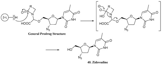 General mechanism of activation of zidovudine prodrugs by β-lactamase enzymes, releasing zidovudine (40) [36].