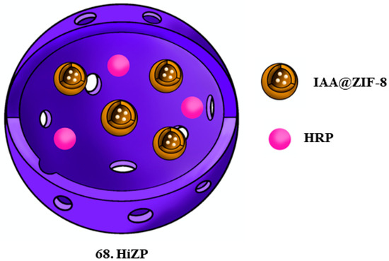 Weng et al. [49] developed an adenosine triphosphate-activated horseradish peroxidase (HRP)/indole-3-acetic acid (IAA) prodrug system. This system, consisting of the encapsulation of HRP and zeolitic imidazolate framework-8 (ZIF-8) loaded with IAA (IAA@ZIF-8) in polyacrylamide (pAAm), was given the name HRP&IAA@ZIF-8@pAAm or HiZP (68, Scheme 6). The mechanism of action of this system relies on the secretion of ATP by bacteria, leading to the decomposition of ZIF-8 and subsequent release of IAA. HRP is then expected to catalyze IAA’s oxidation, generating reactive oxygen species (ROS) responsible for bacterial membrane disruption. The developed system demonstrated the ability to destroy the bacterial membranes of E. coli, leading to its death. Moreover, a high antibacterial activity was detected against ampicillin-resistant S. aureus and ampicillin-resistant E. coli, demonstrating HiZP’s broad-spectrum antibacterial activity. Also, this system’s applicability in wound disinfection with minimal side effects was demonstrated.