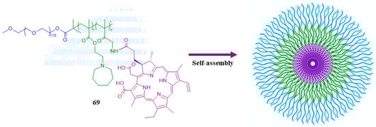In terms of nanotechnology, numerous studies on this topic were reported. In 2021, Wang et al. [50] synthesized and evaluated prodrug (69, Figure 21) forming micelles (Scheme 7). In MRSA and E. coli models, the incubation of varying micelle concentrations for 0.5 h led to a 99.84% reduction of MRSA at 8 µg/mL (pH 5.0), and a 99.46% reduction at 16 µg/mL (pH 7.4). For E. coli, achieving a 99.44% reduction at pH 5.0, a 32 µg/mL micelle concentration was required, while at pH 7.4 no significant antibacterial effect was detected. However, this system’s potential for broad-spectrum antibacterial action was highlighted. Furthermore, in in vivo experiments, the prodrug demonstrated sustained blood circulation and accumulation in the acidic bacterial microenvironment, making it highly efficient against MRSA infected mice.