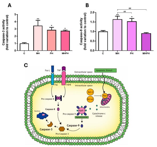 Caspase-3 (A) and caspase-9 (B) activity in Caco-2 cells behind the treatment with 276.97 µg/mL MH, PH and MHPH extracts for 24 h (n = 3). When compared to the control group, the error bars show the mean ± S.E.M. ANOVA p values: p < 0.05 (*), p < 0.01 (**), p < 0.01 (##). (C) Intrinsic and extrinsic pathways of apoptosis. Two different mechanisms can cause apoptosis: the receptor-mediated (extrinsic) and the mitochondrial (intrinsic). The death receptors triggering the extrinsic pathway (e.g., Fas and tumour necrosis factor receptor, TNFR) are located at the plasma membrane and activated by their ligands (Fas-L and TNF, respectively), prompting the activation of the initiator caspase-8. The intrinsic route is triggered by several apoptotic stimuli that increase the ratio of proapoptotic (e.g., Bax)/anti-apoptotic (e.g., Bcl-2, Bcl-xL) mitochondrial proteins, causing the mitochondria to release cytochrome c. In the cytoplasm, cytochrome-c, pro-caspase-9 and the protease activating factor (Apaf-1) form the apoptosome, activating the initiator caspase-9. Pro-caspase-3 is where both routes converge and, after cleavage, becomes the active effector caspase-3, determining the end and an irreversible point of apoptosis.