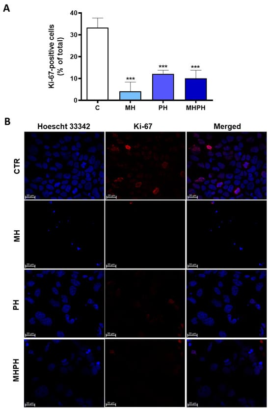 Proliferation index of Caco-2 cells after treatment with 276.97 µg/mL MH, PH and MHPH extracts for 24 h determined by Ki-67 immunofluorescence analysis (n = 3). (A) Proportion of cells that are positive for Ki-67 compared to all cells. The fold variation between the treated and untreated control groups is used to express the results. Mean ± S.E.M. is shown by error bars; ANOVA p values: *** p < 0.001. (B) Confocal microscopy photos of the control and treated groups that are representative of the Ki-67 labelling (red). Images were captured at a magnification of 630× using the Zeiss LSM 710 laser scanning confocal microscope (Carl Zeiss, Gottingen, Germany). Hoechst 33342 is used to stain the nuclei (blue).