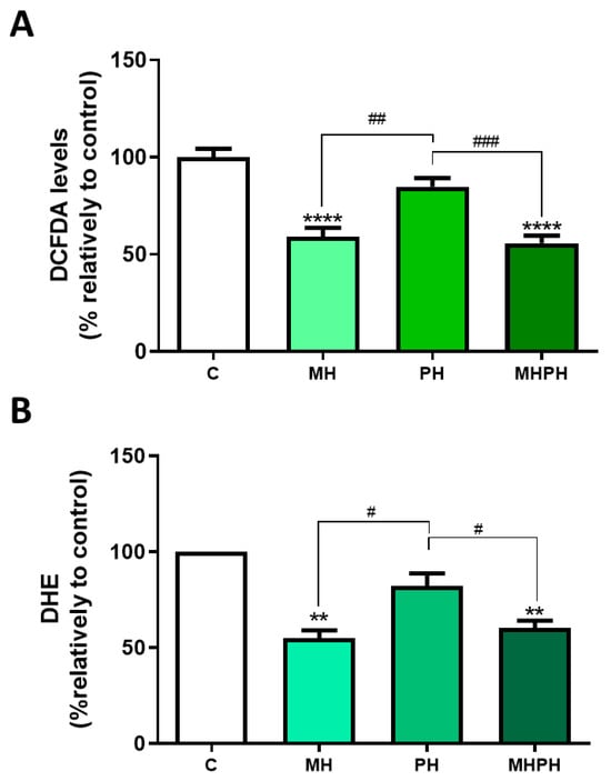 Cellular ROS production in Caco-2 cells after treatment with 276.97 µg/mL MH, PH and MHPH extracts for 24 h measured using dichlorofluorescein diacetate (DCFDA, (A)) or dihydroethidium (DHE, (B)) (n = 3). The fold variation between the treated and untreated control groups is used to express the results. The mean ± S.E.M., ANOVA p values: p < 0.05 (#), p < 0.01 (##), p < 0.001 (###), p < 0.01 (**), and p < 0.0001 (****) are indicated by the error bars.