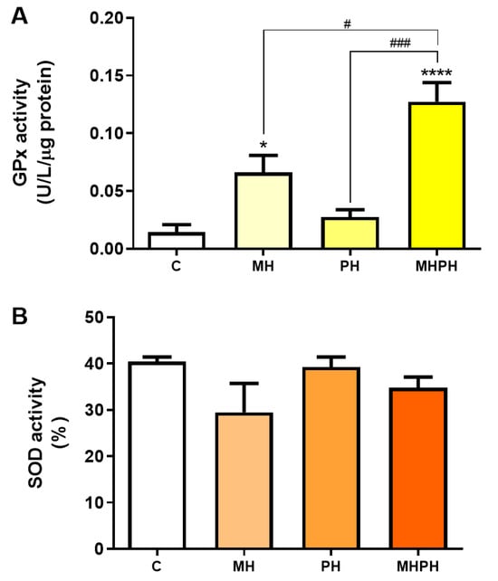 Activity of glutathione peroxidase (GPx, (A)) and superoxide dismutase (SOD, (B)) in Caco-2 cells behind the treatment with 276.97 µg/mL MH, PH and MHPH extracts for 24 h (n = 3). Enzyme activity is normalised to protein content. When compared to the control group, the error bars show the mean ± S.E.M., ANOVA p values: p < 0.05 (#), p < 0.001 (###), p < 0.05 (*), and p < 0.0001 (****).
