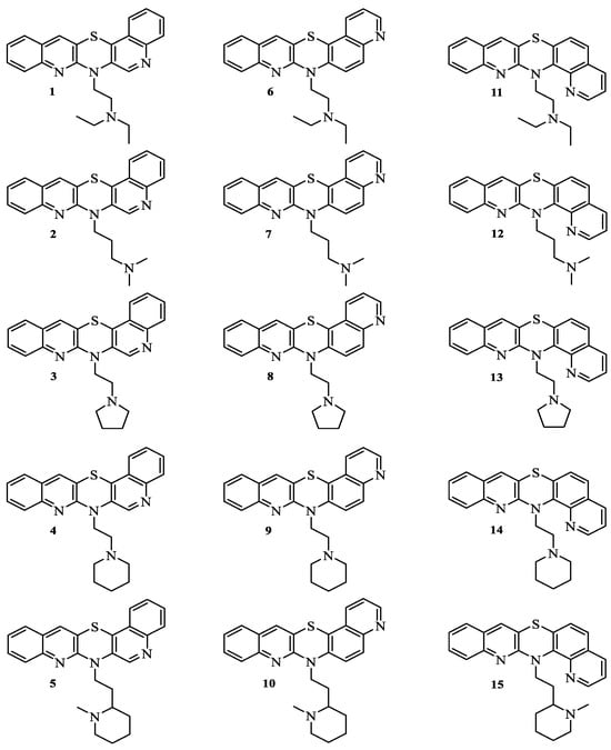 The studied compounds, i.e., 7-substituted diquino[3,2-b;3′,4′-e]thiazines 1–5, 7-substituted diquino[3,2-b;6′,5′-e]thiazines 6–10, and 14-substituted diquino[3,2-b;8′,7′-e]thiazines 11–15, were previously designed and synthesized [24]. The chemical structures of the examined compounds are shown in Figure 1. The summary formulas, molecular weights, melting points, and physical appearances of the tested diquinothiazines 1–15 are listed in Table S3.
