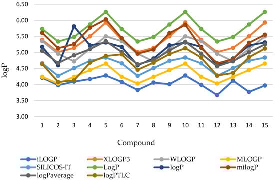 The linear equations obtained between the theoretical partition coefficients and chromatographic parameters of lipophilicity of the tested compounds 1–15 (Table 10) confirmed the usefulness of iLOGP, XLOGP3, WLOGP, MLOGP, LOGP, miLOGP, logPaverage, and SILICOS-IT for predicting the experimental value of this parameter in the form of RM0.