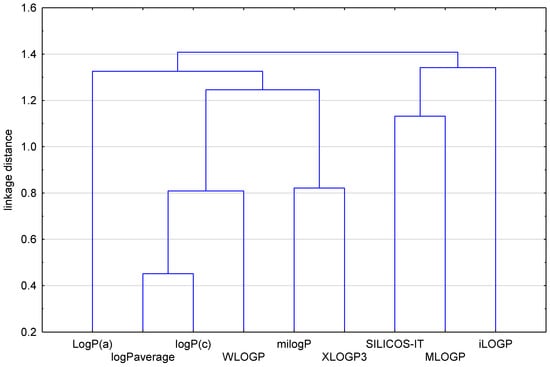 In order to compare all obtained theoretical values of the partition coefficient of the examined drugs expressed in the form of logP, and to then estimate the lipophilic character of the studied N-dialkyloaminoalkyldiquinothiazines, a chemometric approach, i.e., cluster analysis (CA) with Euclidean distance, was conducted. The results are presented in Figure 3 and Figure 4.