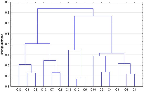 Figure 4 shows the similarity analysis of the examined compounds based on their partition coefficients. According to the computed lipophilicity parameters (the logP values), the studied compounds can be divided into two groups based on variation in their structural particularities, i.e., depending on the kind of substituent that may influence the lipophilic character of these compounds. The first group consists of the compounds C13, C8, and C3 in the first subgroup, with C12, C7, and C2 in the second subgroup. Similarly, the second group is divided into two smaller visible subgroups, with C15, C10, and C5 in the first subgroup and C14, C9, C4, C11, C6, and C1 in the second subgroup.