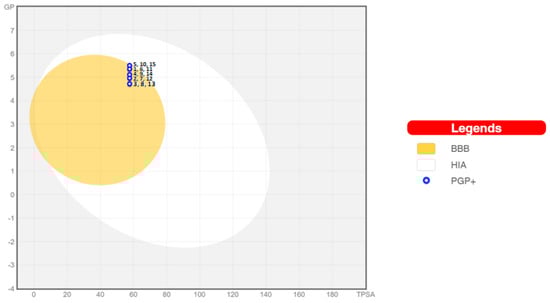 Absorption from the gastrointestinal tract and access to the brain are two pharmacokinetic parameters important to estimate at different stages of the drug discovery process. For this purpose, an estimated method of penetration into the brain or intestines has been developed—boiled egg [55]. It is an accurate predictive model that works by calculating the lipophilicity and polarity of small molecules. At the same time, penetration into both the brain and intestines is predicted based on the same two physicochemical descriptors. This computational method was also used to analyze the tested diquinothiazines 1–15 (Figure 6). Molecules located in the white region are expected to be passively absorbed in the gastrointestinal tract, while molecules in the “yolk” region are expected to passively cross the BBB. It can be observed that none of the analyzed compounds can be passively absorbed in the intestines, but all of them can pass through the BBB. This shows that the dosing compliance may be poor due to the inability of all the compounds to be absorbed through the intestines. Additionally, all tested compounds can become substrates for p-glycoprotein (blue points).