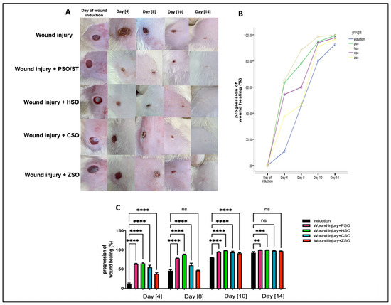 Macroscopic assessment of the morphological appearance and progression of wound healing (%) on days 4, 8, 10, and 14 after wound induction. (A): Representative photo-macrographs of wound morphology, (B): progression of wound healing (%) determined using Image J, an image analyzer, and compared using Mixed model ANOVA, (C): progression of wound healing (%) determined using Image J, an image analyzer, and compared using one-way ANOVA and subsequent multiple comparisons using Tukey’s test. Data are expressed as the mean ± SD [n = 9], and the number of asterisks “*” above the columns indicates the strength of significance as follows: ** p < 0.01, *** p < 0.001, and **** p < 0.0001, while (ns) stands for non-significant. CSO; cantaloupe seed oil, HSO; honeydew melon seed oil, PSO; pumpkin seed oil, ST; standard, ZSO; zucchini seed oil.