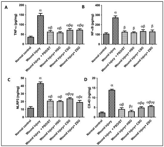 Effect of different oils on the skin tissue contents of (A) TNF-α, (B) NF-κB, and (C) NLRP3 as inflammatory markers in addition to serum levels of (D) CX-43 as a skin integrity marker in wound-injured rats. Statistical analysis was achieved with one-way ANOVA and subsequent multiple comparisons using Tukey’s test. Data are expressed as the mean ± SD [n = 6] with p-value < 0.05 as compared with the normal control group (α) and the wound injury (β), wound injury + PSO/ST (γ), wound injury + HSO (φ), and wound injury + CSO (ε) groups. [F-value of TNF-α = 198.9, F-value of NF-κB = 139.8, F-value of NLRP3 = 253.5, and F-value of CX-43 = 423.8.] CX-43; connexin-43, CSO; Cantaloupe seed oil, HSO; Honeydew melon seed oil, NLRP3; NLR family pyrin domain containing 3, NF-κB; nuclear transcription factor kappa B, PSO; pumpkin seed oil, ST; standard, TNF-α; tumor necrosis factor-alpha, ZSO; Zucchini seed oil.