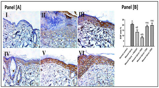Representative photomicrographs of the immunohistochemistry expression of epidermal growth factor (EGF) after 14 days of wound induction. Panel [A]: skin sections of the newly formed epidermal layer showing areas stained for EGF expression in the normal skin of healthy rats (I), wound injury group (II), PSO/ST-treated rats (III), rats treated with HSO (IV), CSO (V), and ZSO (VI). Panel [B] represents EGF area% expression (the mean of 10 microscopic fields ± SD) in all treated groups. One-way ANOVA and subsequent multiple comparisons using Tukey’s test as compared with the normal control group (α) and the wound injury (β), wound injury + PSO/ST (γ), and wound injury + HSO (φ), groups [F-value of EGF% = 197.3]. CSO; cantaloupe seed oil; EGF; epidermal growth factor; IHC; immunohistochemistry; HSO; honeydew melon seed oil; PSO; pumpkin seed oil; ST; standard; ZSO; zucchini seed oil.