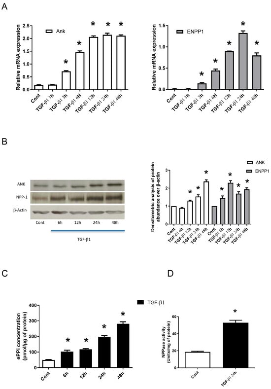 First, we studied the kinetics of Ank and Enpp1 expression in response to a TGF-β1 (10 ng/mL) challenge in rat synovial fibroblast, at the mRNA and protein level. Enzymatic activities (Enpp1 and APase) were also assessed on total cell protein extracts 24 h after TGF-β1 stimulation. ePPi levels were determined in culture supernatants until 48 h after TGF-β1 challenge.