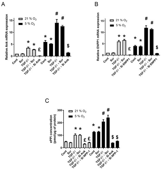 Ex vivo explants cultures of SM were submitted to RNA silencing, as presented in the previous section, to investigate the contributions of Ank and Enpp1 to TGF-β1-induced production of ePPi when exposed to normoxia (21% O2) and relative hypoxia (5% O2). Exposure to low oxygen concentration led to an increase in Ank and Enpp1 mRNA expression, as shown in Figure 2A,B. This was accompanied by an important increase in ePPi level (Figure 2C). These effects were similar as those obtained in synovial fibroblasts cultured in monolayer under hypoxia.