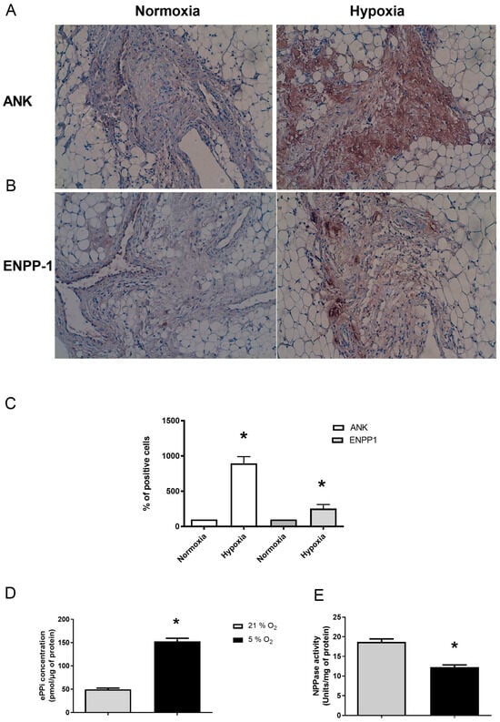 Immunohistochemistry (IHC) analyses of SM explants demonstrated for Ank (Figure 3A), and, to a lesser extent, for Enpp1 (Figure 3B), an increased expression of these proteins in tissue under hypoxia for 48 h compared to normoxia (Figure 3C). In addition, ePPi level increased by 3-fold under hypoxia (Figure 3D), while ENPP1 activity decreased by around 30% (Figure 3E).