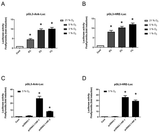 Figure 4. Hypoxia increases the transactivation of Ank promoter in vitro. (A,B) Synovial fibroblasts were transfected or not for 24 h then cultured either in normoxia (21% O2) or hypoxia (various oxygen percentage). (A) Synovial fibroblasts were transfected or not with pGL3-Ank-Luc and pCMV-Renilla reporter. (B) Control of hypoxia efficiency using synovial fibroblasts transfected or not with pGL3-HRE-Luc and pCMV-Renilla reporter. (C,D) Synovial fibroblasts were transfected or not then cultured in hypoxia (5% O2). (C) Synovial fibroblasts were transfected or not with pcDNA3.1, or pcDNA3.1 construct to overexpress HIF-1 or HIF-2, and with pGL3-Ank-Luc and pCMV-Renilla reporter. (D) Synovial fibroblasts were transfected or not with pcDNA3.1, or pcDNA3.1 construct to overexpress HIF-1 or HIF-2, and with pGL3-HRE-Luc and pCMV-Renilla reporter before being cultured in hypoxia. Results are presented as mean luciferase activity ratio of Firefly/Renilla (±S.D.). Statistically significant differences are indicated as * for p < 0.05 from the control in normoxia (A,B) and as * for p < 0.05 from the control in hypoxia (5% O2) (C,D). (Ank: inorganic pyrophosphate transport regulator; Cont: control condition meaning transfection with pGL3-Ank-Luc (A,C) or pGL3-HRE-Luc (B,D) and pCMV-Renilla reporter; Hif: hypoxia-induced factor; HRE: Hif-response element; Luc: Firefly luciferase; SD: standard deviation).