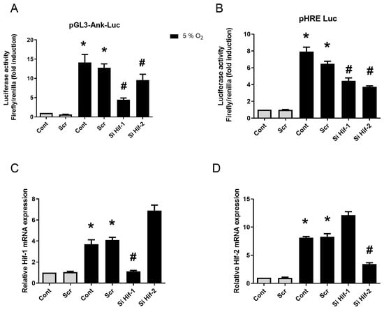 Figure 5. HIF-1, but not HIF-2, increases Ank promoter transactivation in vitro. (A,D) Synovial fibroblasts were transfected or not with siRNA for 12 h, then with plasmids for 24 h, before being challenged with 10 ng/mL of TGF-β1 for 48 h either in normoxia (21% O2) or hypoxia (5% O2). (A,C,D) Synovial fibroblasts were transfected or not with scramble siRNA, or siRNAs directed against Hif-1 or Hif-2, then with pGL3-Ank-Luc and pCMV-Renilla reporter. (B) Control of hypoxia efficiency using synovial fibroblasts transfected or not with scramble siRNA, or siRNAs directed against Hif-1 or Hif-2, then with pGL3-HRE-Luc and pCMV-Renilla reporter. (A) Results for Ank promoter transactivation are presented in histograms as mean luciferase activity ratio of Firefly/Renilla (±S.D.). (B) Results for HRE transactivation are presented in histograms as mean luciferase activity ratio of Firefly/Renilla (±S.D.). Statistically significant differences are indicated as * for p < 0.05 from the control in normoxia and as # for p < 0.05 from control in hypoxia (5% O2). (Ank: inorganic pyrophosphate transport regulator; Cont: control condition meaning no siRNA transfection; ePPi: extracellular inorganic pyrophosphate; Hif: hypoxia-induced factor; HRE: Hif-response element; Luc: Firefly luciferase; Rp29: ribosomal protein 29; RT-qPCR: reverse transcription–quantitative polymerase chain reaction; Scr: scramble RNA meaning non-silencing RNA; SD: standard deviation; Si: means siRNA or small interfering RNA).
