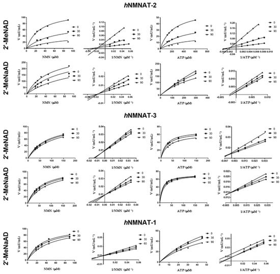 Human NMNAT inhibition by 2′-MeNAD (1) and 2′-MeNaAD (3). Hyperbolic plots of initial rates as a function of NMN or ATP concentration measured at a fixed saturating concentration of one substrate (0.5 mM) in the absence and presence of varying concentrations of 2′-MeNAD and 2′-MeNaAD. The same data are also presented by a double-reciprocal (Lineweaver–Burk) plot illustrating different modes of inhibition. Each data point is the average value derived from three replicates. Error bars are explicitly omitted for clarity.