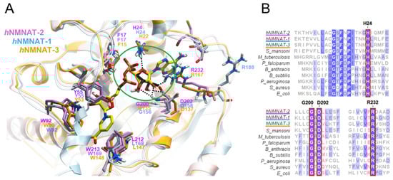 NAD binding across hNMNATs. (A) Superposition of hNMNATs in complex with NAD product showing the native South-type conformation of adenosyl ribose and its stabilizing interactions. PDB IDs for hNMNAT-1 and hNMNAT-3 are 1kqn and 1nuu, respectively. For hNMNAT-2, we generated a model with Alphafold2. Key residues of the NAD binding site and the NAD molecule (in yellow) are rendered as sticks. Dashed lines represent the H-bonds. Inside the green circle, the North-type conformation of a 2′-methyl-ribose (in black) is superposed on native adenosyl ribose, showing its perturbation effect. (B) Excerpt of a structure-based sequence alignment of representative NMNATs, including eukaryotic and prokaryotic pathogens. The intensity of the background color indicates sequence conservation. Key residues (numbered by hNMNAT-2 sequence) involved in adenosine binding are outlined with red boxes.