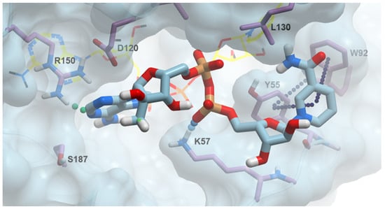 In contrast, the North-type conformation of the 2′-methyl-NAD, as modelled in Figure 3A, would not preserve the natural interactions of the ribose with the binding pocket: the 3′-OH would be too far away to maintain its contact with the glycine, while 2′-OH retains only one H-bond out of three. Finally, the hydrophobic 2′-methyl group would face two charged aminoacids, thus destabilizing the H-bonding network around the ribose. Consequently, we propose that the 2′-methyl-substituted NAD, not fitting the traditional AMP subsite, should bind differently (see Figure 4), in line with its predominant noncompetitive character. It is worth noting that the adenosyl moiety binding site is universally conserved across the NMNAT family (Figure 3B), which includes actively pursued targets against tuberculosis [28,29,30] and other bacterial pathogens [31,32], the protozoan malaria parasite [33], and the flatworm Schistosoma mansoni [34]. This observation expands future potential applications of 2′-methyl-NAD analogues to other clinically relevant members of the NMNAT family, with minimal impact on normal human host cells.