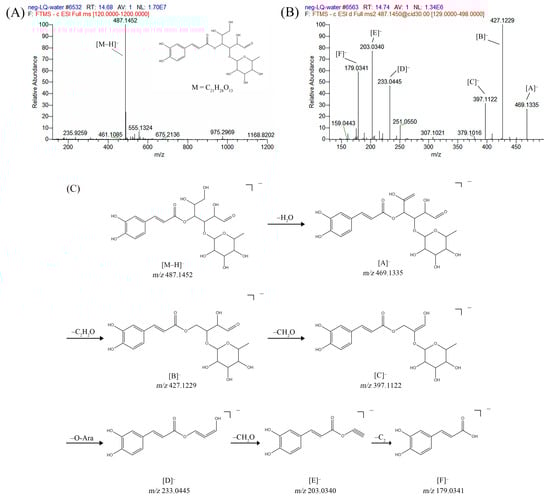 Identification of cistanoside F (compound 18). Full-scan MS (A) and MS2 (B) in negative-ionization mode—summarization of inferred fragmentation approaches of [M − H]− at m/z 487.1452 (C).