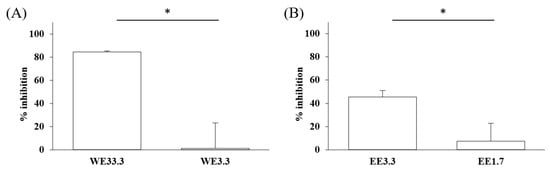 Inhibitory effects of Lianqiao (A) water and (B) ethanol extracts at different concentrations on binding interaction between SARS-CoV-2 spike protein and ACE2. WE33.3 and WE3.3 stand for the water extracts at concentrations of 33.3 and 3.3 mg dry Lianqiao equivalents/mL in the testing mixture, respectively. EE3.3 and EE1.7 stand for ethanol extracts at concentrations of 3.3 and 1.7 mg dry Lianqiao equivalents/mL in the testing mixture, respectively. Results are expressed as mean ± SD of experiments performed in triplicate, and values are on a dry botanical weight basis. * indicates significant differences (p < 0.05).