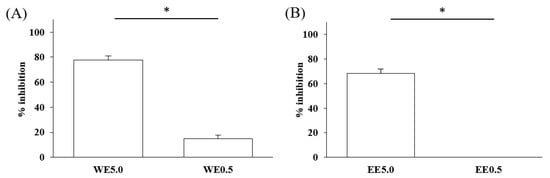 ACE2 inhibitory effects of Lianqiao (A) water and (B) ethanol extracts at different concentrations. WE5.0 and WE0.5 stand for the water extracts at concentrations of 5.0 and 0.5 mg dry Lianqiao equivalents/mL in the testing mixture, respectively; EE5.0 and EE0.5 stand for the ethanol extracts at concentrations of 5.0 and 0.5 mg dry Lianqiao equivalents/mL in the testing mixture, respectively. Results are expressed as mean ± SD of experiments performed in triplicate, and values are on a dry botanical weight basis. * indicates significant differences (p < 0.05).