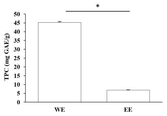 Total phenolic content (TPC) of Lianqiao water (WE) and ethanol extracts (EE). Results are expressed as mean ± SD of experiments performed in triplicate, and values are on a dry botanical weight basis. * indicates significant differences (p < 0.05).