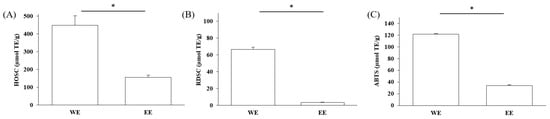 Relative free radical scavenging activities of Lianqiao water (WE) and ethanol extracts (EE) against (A) HO●, (B) DPPH●, and (C) ABTS●+. Results are expressed as mean ± SD of experiments performed in triplicate, and values are on a dry botanical weight basis. * indicates significant differences (p < 0.05).