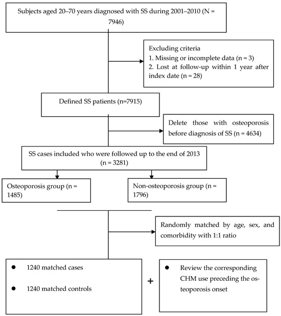Recently, Chinese herbal medicine (CHM), a specialized therapy within traditional Chinese medicine, has been extensively employed in treating human diseases, especially in SS. A systematic review of 52 randomized control trials showed that CHM, delivered either alone or in combination with other Western medicine, may be more effective in managing primary SS symptoms than conventional medicine [11]. Chen and colleagues observed that some herbals, such as Gan-Lu-Yin and Jia-Wei-Xiao-Yao-San, have been implicated in controlling SS symptoms [12]. The mechanisms by which CHM aids those with SS may include regulation of inflammatory responses, increased antioxidant capacity, and improvement of sicca [13]. However, no studies have yet directly compared the therapeutic effect of CHM in delaying or minimizing the onset of osteoporosis in those with SS. Since existing treatments provide no effective cure for most autoimmune diseases, adding CHM to routine care might prevent or delay bone mass impairment. We, therefore, mapped out a nested case-control study to clarify whether adding CHM to the conventional treatment would reduce the chance of osteoporosis in those with SS.