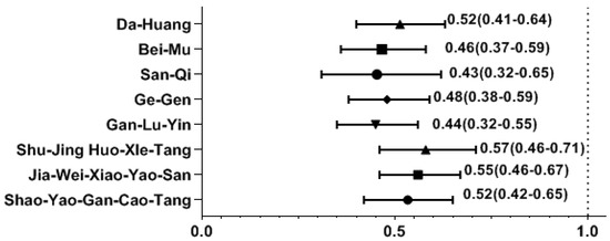 Among the most common single-herb and multi-herb formulae used to treat SS, we found that the use of several CHM products was correlated with a decreased likelihood of osteoporosis. The osteoporosis risk was significantly reduced in those using CHM products containing Da-Huang, Bei-Mu, San-Qi, Ge-Gen, Shao-Yao-Gan-Cao-Tang (SYGCT), Gan-Lu-Yin (GLY), Jia-Wei-Xiao-Yao-San (JWXYS), and Shu-Jing-Huo-Xue-Tang (SJHXT) (Figure 2).