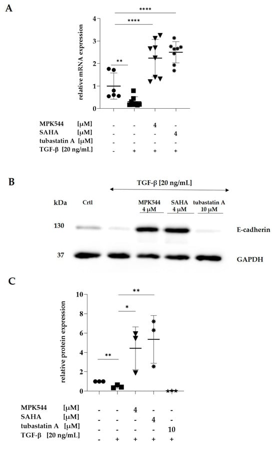 ; 20 ng/mL TGF-β with 10 µM tubastatin *). Error bars indicate standard errors of mean (of at least three independent experiments, with * = p ≤ 0.05; ** = p ≤ 0.01; and **** = p ≤ 0.0001).