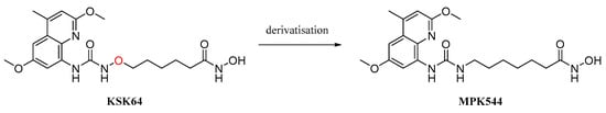 - Stenzel, K.; Hamacher, A.; Hansen, F.K.; Gertzen, C.G.W.; Senger, J.; Marquardt, V.; Marek, L.; Marek, M.; Romier, C.; Remke, M.; et al. Alkoxyurea-Based Histone Deacetylase Inhibitors Increase Cisplatin Potency in Chemoresistant Cancer Cell Lines. J. Med. Chem. 2017, 60, 5334–5348. [Google Scholar] [CrossRef] [PubMed]