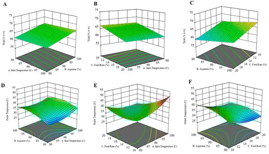 Three-dimensional (3D) response surface plots of (A) yield as a function of X1: inlet temperature and X2: aspirator, (B) yield as a function of X1: feed rate and X2: inlet temperature, (C) yield as a function of X1: Aspirator and X2: feed rate, (D) outlet temperature as a function of X1: aspirator and X2: inlet temperature, (E) yield as a function of X1: feed rate and X2: inlet temperature, (F) yield as a function of X1: Aspirator and X2: feed rate.