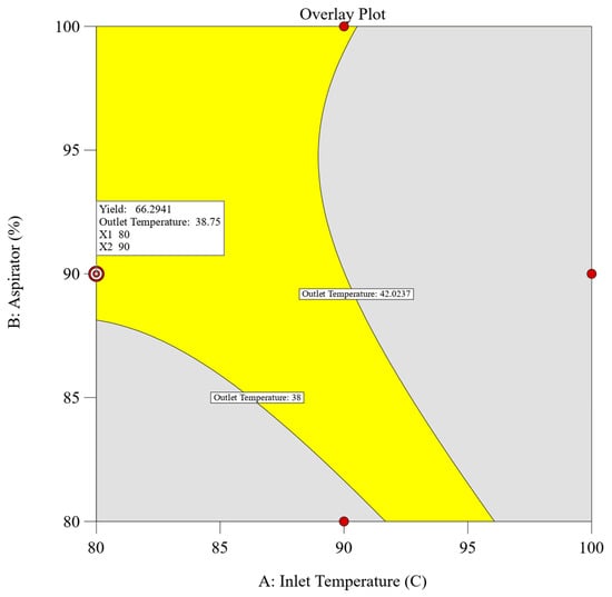 A combined approach utilizing both numerical and graphical optimization methodologies was implemented to define the design space. The primary objective was to establish parameters that would maximize the dependent variables, specifically achieving the highest yield while ensuring that the outlet temperature remained below 42 °C (corresponds to the glass transition temperature of the polymer). Adhering to these predefined criteria, numerical optimization using design expert v13 software was employed, yielding multiple solutions characterized by desirability values. Among these solutions, the spray drying process parameters comprising an inlet temperature of 80 °C, an aspirator setting of 90%, and a feed rate of 10% achieved the highest desirability score of 0.875, meeting our target response. To further validate these findings, graphical optimization techniques were employed. An overlay plot was constructed to delineate the design space and confirm the results obtained through numerical optimization. Figure 2 illustrates the overlay plot, presenting the combination of independent parameters and the resultant values of the dependent parameters. Within the overlay plot, the yellow region signifies the designated design space, whereas the grey area shows the remaining experimental domain. Enclosed by contour lines, each boundary limit corresponds to the target set for the individual dependent parameters.