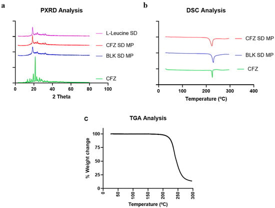 Figure 4b illustrates the DSC thermographs of CFZ, BLK SD MPs, and CFZ SD MPs. At 220 °C, the initial DSC thermograph of pure drug CFZ revealed a sharp endotherm [8], representing its melting point and confirming the crystalline nature of the drug. In this study, the CFZ SD MPs containing L-leucine as an inert carrier also showed endothermic transition at 218 °C. However, the DSC data of CFZ SD MPs seemed contrary to PXRD analysis (which suggests complete encapsulation of CFZ in the polymer). Therefore, to validate the absence of unentrapped drugs in microparticle formulation, we performed DSC of BLK SD MPs. The DSC thermograph of BLK SD MPs, which does not contain CFZ, also demonstrated an endothermic melting peak at 218 °C, suggesting that the endothermic peak might be due to other endothermic events. The DSC of BLK SD MPs indicated that the peak could be due to the presence of L-leucine. A similar phenomenon was observed by Tavares et al. in their work when developing PLGA dry powder microparticles for vaccine delivery to the lungs [42]. They observed that L-leucine underwent degradation at 218 °C, marked by a sharp melting endothermic peak on the DSC thermograph. To confirm this, we performed the TGA analysis of CFZ SD MPs. The TGA graph (Figure 4c) demonstrated that L-leucine underwent thermal degradation at 218 °C, marked by a steep decrease in the % weight of the sample. Therefore, we could assume that the endothermic peak at 218 °C in CFZ SD MPs was due to L-leucine. The above solid-state characterization studies thus reinforce the successful entrapment of CFZ into the microparticles.