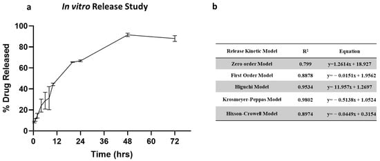 (a) In vitro release of CFZ from CFZ SD microparticles indicating burst release in 12 h and complete release within 72 h. (b) Summary of drug release kinetic models.